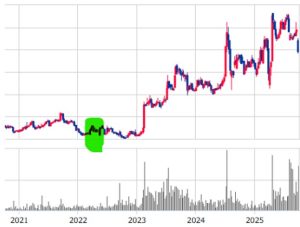 出来高は下図の通り、平均で10倍程度まで拡大。株価は取り組み開始から3.5年で2.5倍まで上昇。